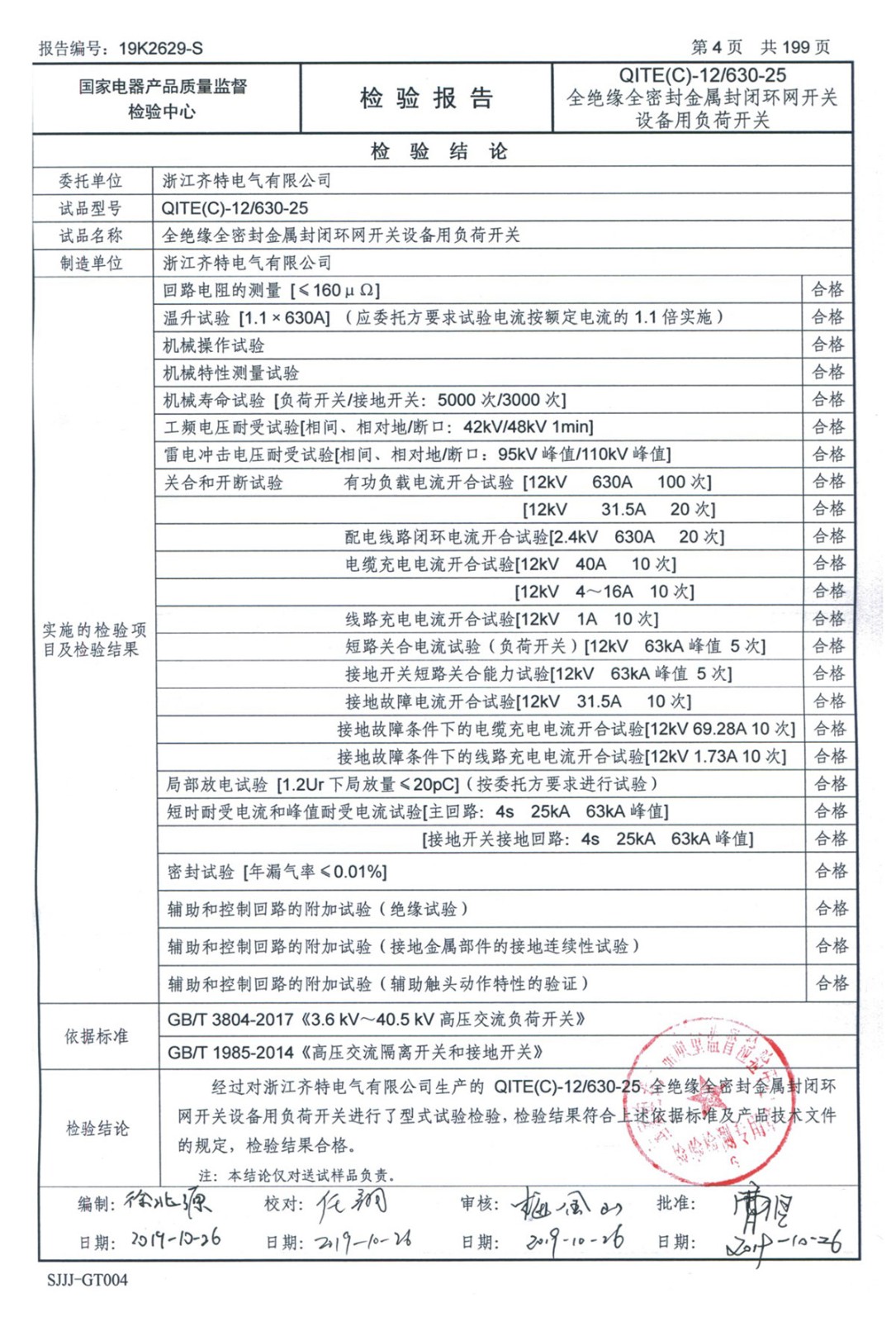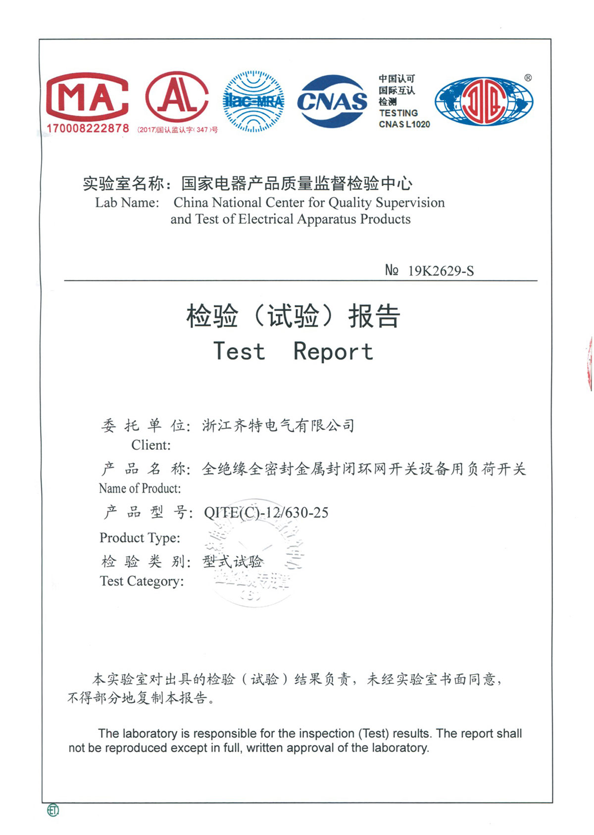QITE(C)-12/630-25全绝缘全密封金属封闭环网开关设备用负荷开关检验报告
