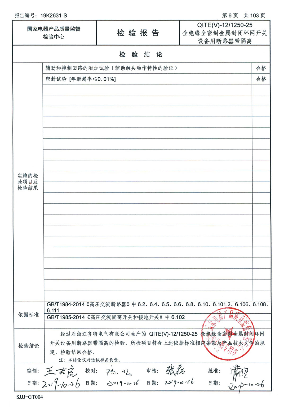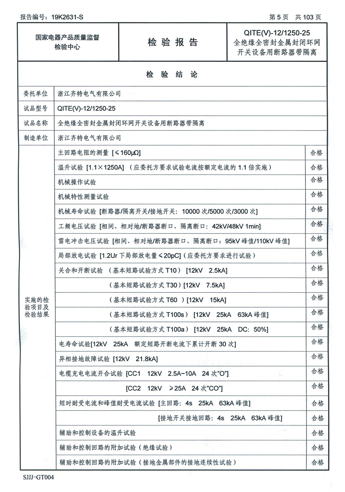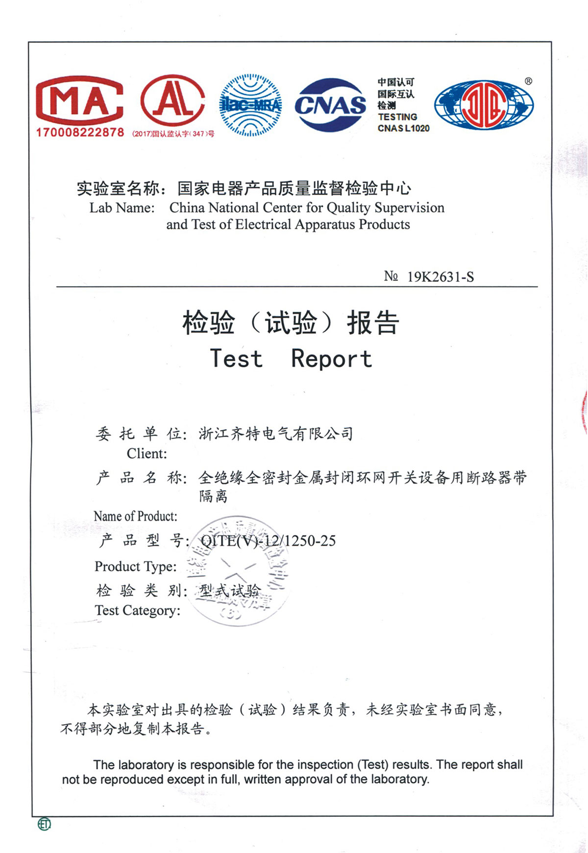 QITE(V)-12/1250-25全绝缘全密封金属封闭环网开关设备用断路器带隔离检验报告