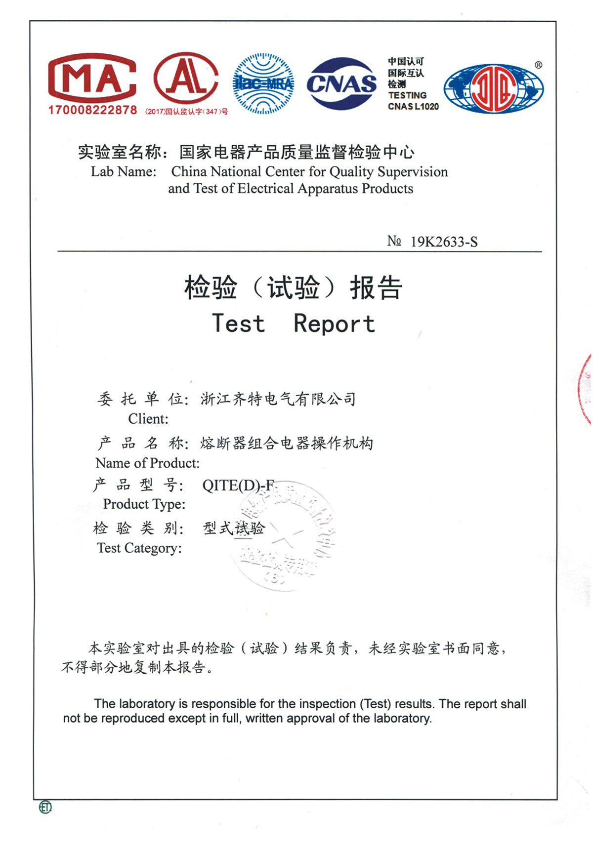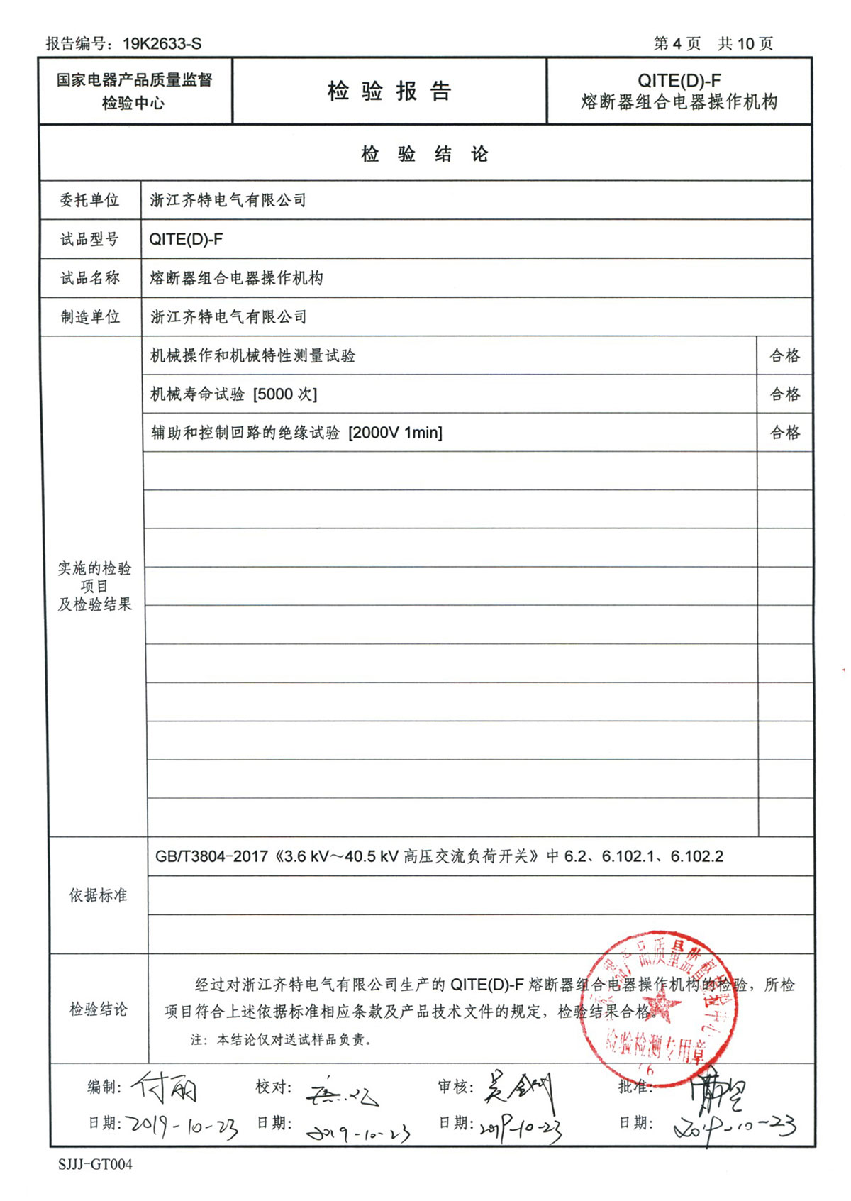 QITE(D)-F熔断器组合电器操作机构检验报告